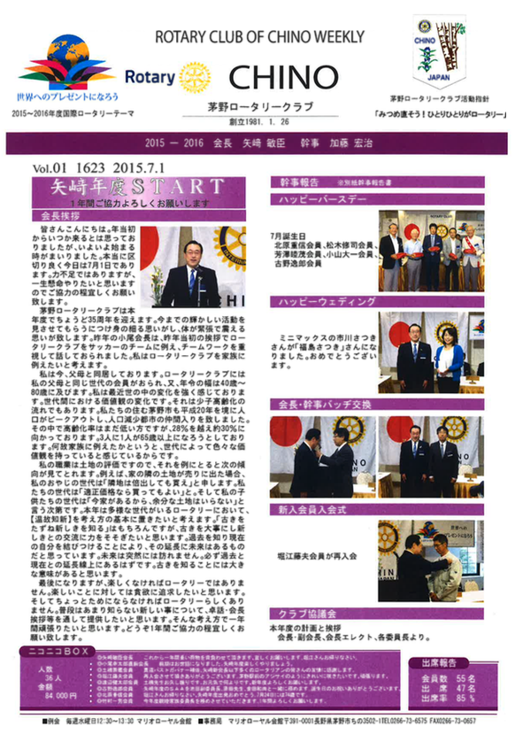 皆さんこんにちは。今日は弁護士の竹村先生の卓話ということで、大変楽しみにしております。実は、私は裁判所とご縁がありまして、長野家庭裁判所の調停委員をさせて頂いて25年目となります。裁判所は比較的なじみの薄い役所でありますが、当クラブでも牛山武明さん、北原重信さんも関係者であり、柳澤孝男さんは現役です。
